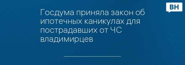 Закон принят Госдумой в окончательном чтении. Он дает право гражданам, признанным пострадавшими от ЧС природного или техногенного характера, на использование ипотечных каникул по договорам потребительского кредита.