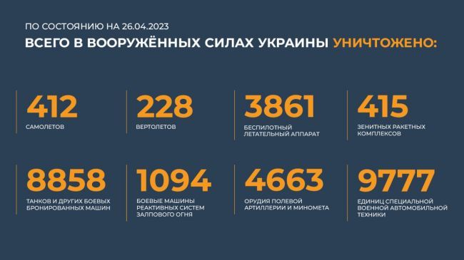 Всего с начала проведения специальной военной операции уничтожены: 412 самолетов, 228 вертолетов, 3861 беспилотный летательный аппарат, 415 зенитных ракетных комплексов, 8858 танков и других боевых бронированных машин, 1094 боевые машины реактивных систем залпового огня, 4663 орудия полевой артиллерии и минометов, а также 9777 единиц специальной военной автомобильной техники.