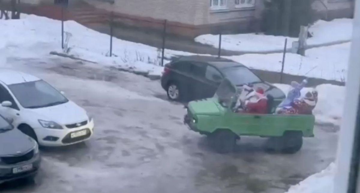 Житель города Новомосковск снял из окна своего дома необычную картину 2 января. На кадрах мы видим, как три Деда Мороза на машине вместе со Снегурочкой сели в машину и поехали поздравлять с Новым годом случайных прохожих.