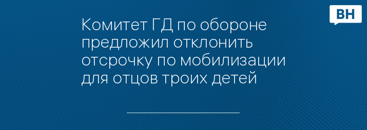 РБК сообщает, что комитет Госдумы предложил отклонить проект об отсрочке от мобилизации для отцов троих детей.