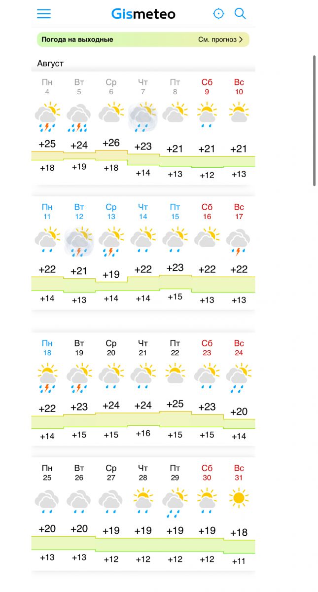 Так, Gismeteo до 31 августа обещает в регионе лишь редкие денечки без осадков. Причём один такой выпадет на завтрашний воскресный выходной.