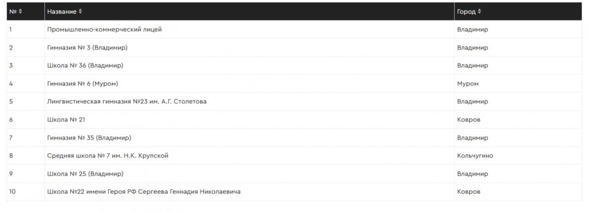 По сравнению с прошлым годом, в рейтинге появились новички - это Средняя школа № 7 им. Н.К. Крупской (Кольчугино) и Школа №22 имени Героя РФ Сергеева Геннадия Николаевича (Ковров). Состав первой тройки в рейтинге не изменился.