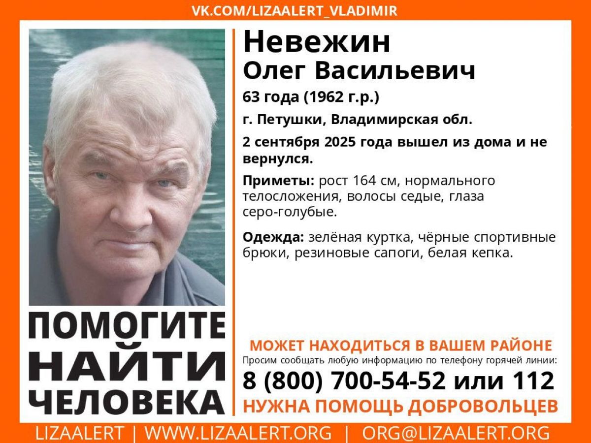 Во Владимирской области ищут 63-летнего Олега Невежина. Как сообщает поисковый отряд «ЛизаАлерт», 2 сентября в городе Петушки он вышел из дома и не вернулся до сих пор.