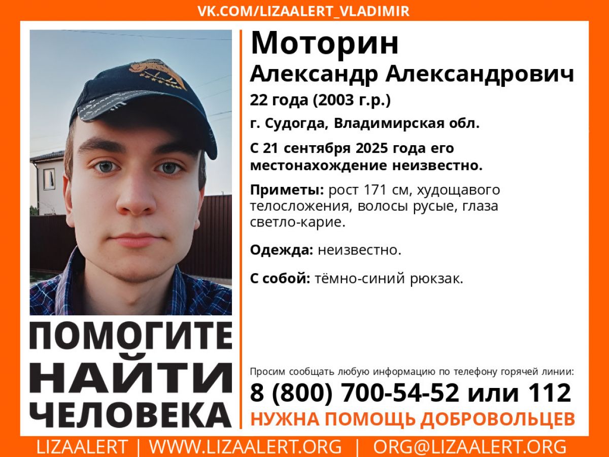В городе Судогда Владимирской области пропал 22-летний Александр Моторин. Его местонахождение неизвестно с 21 сентября.