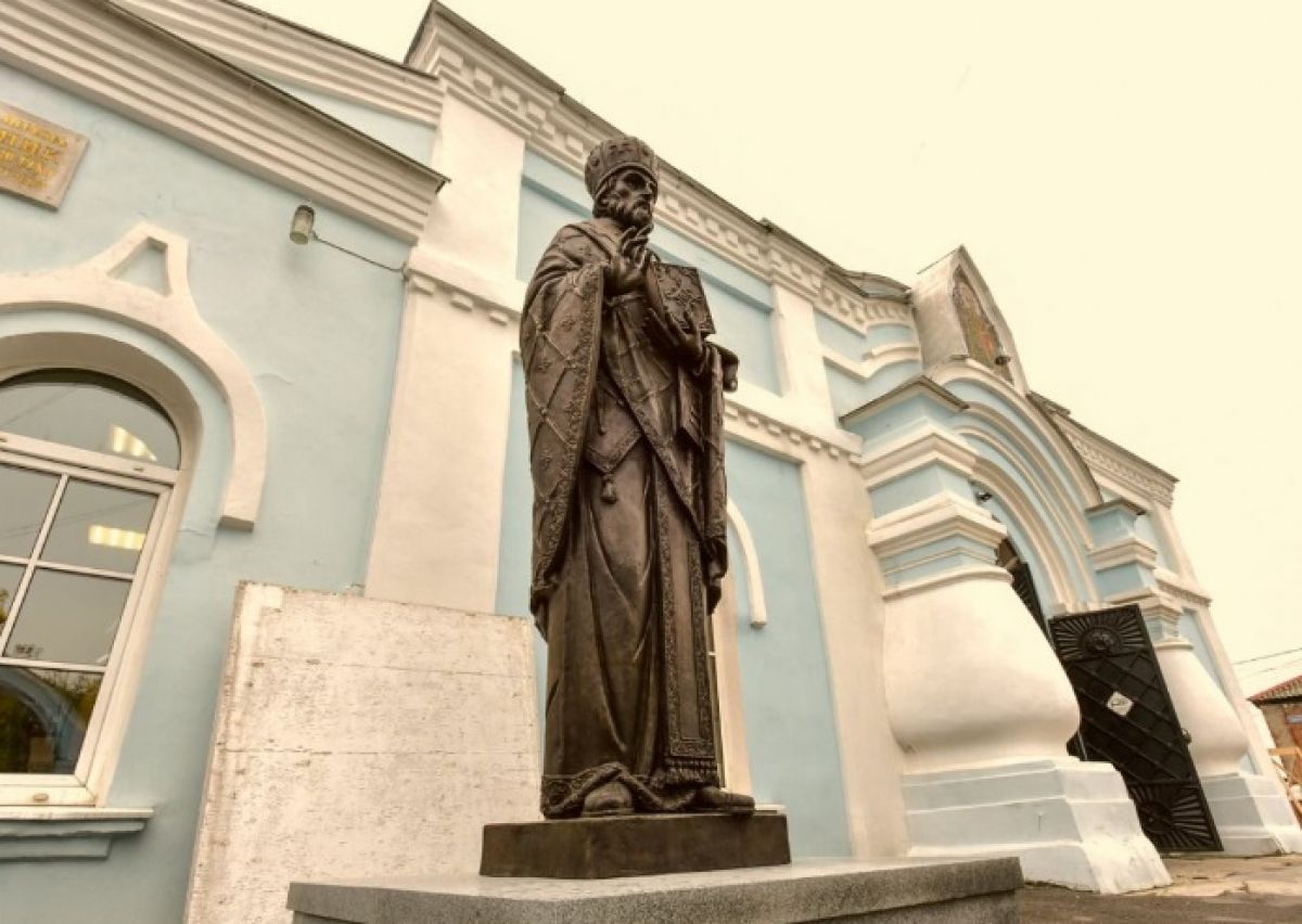 Трехметровая бронзовая скульптура, установленная на мраморном постаменте, встречает посетителей при входе в храм с северной стороны. Автором произведения стал известный российский художник Алексей Дикунов, член Союза художников России. Ранее в его творческом багаже уже были монументы святителю Митрофану Воронежскому у Благовещенского кафедрального собора и святителю Тихону Задонскому в Рождество-Богородицком мужском монастыре, созданные в сотрудничестве с членами его семьи.