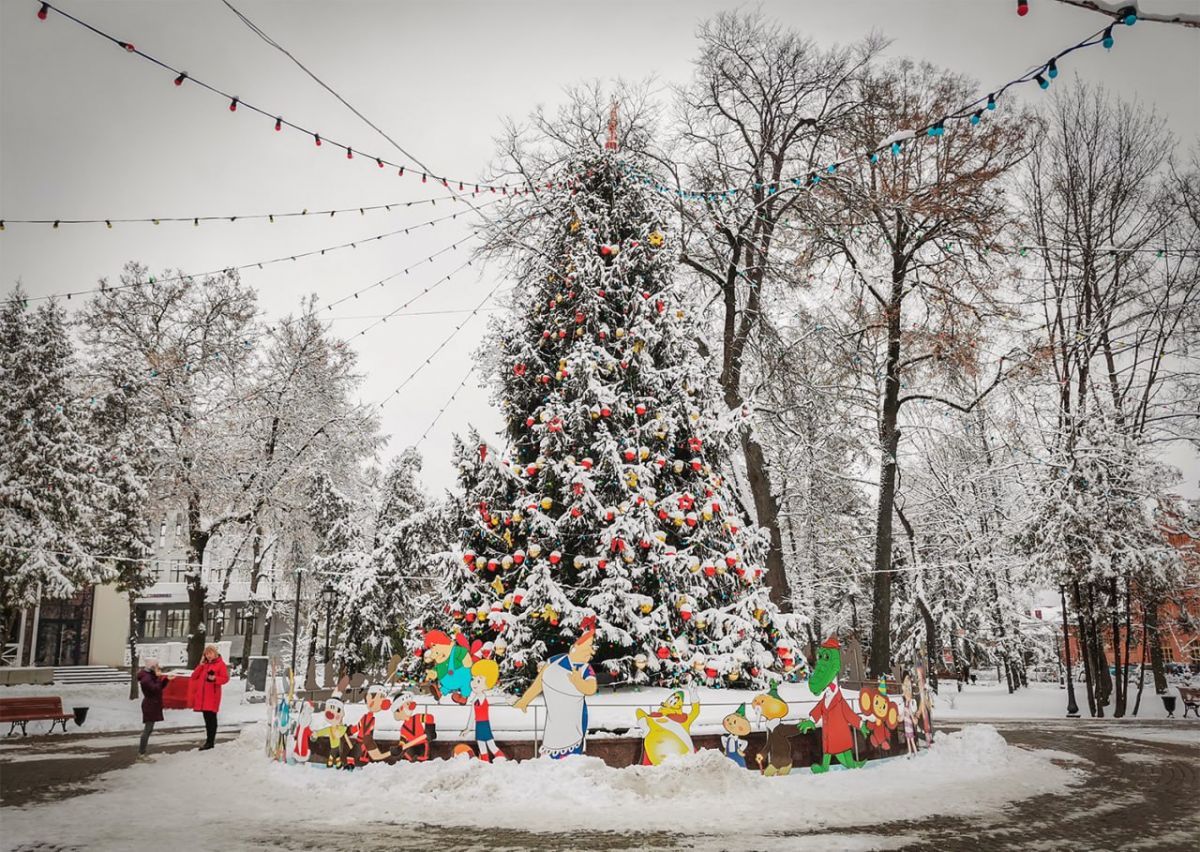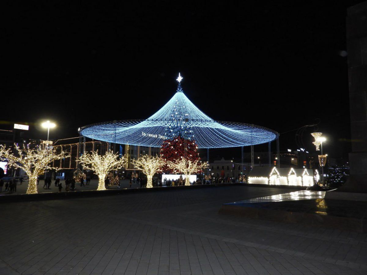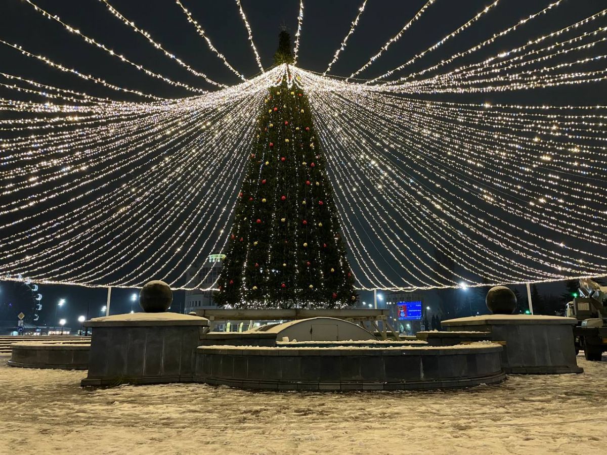 В городе на площади Ленина появилась праздничная ель и украшенные домики ярмарки. Также, жители и гости города, могут полюбоваться фигурами световых оленей и скандальных Снегурочки и Деда Мороза.