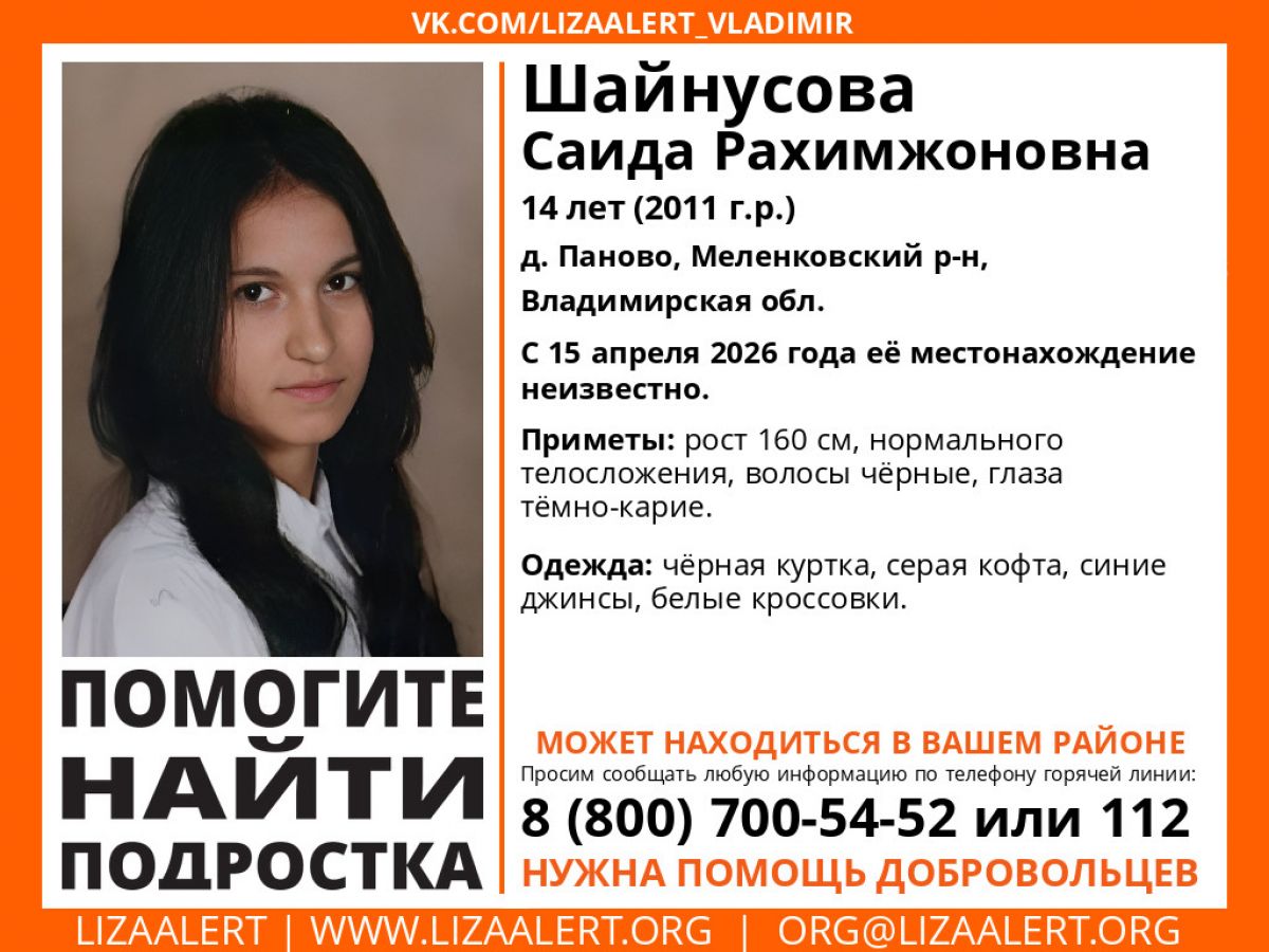 В Меленковском районе Владимирской области продолжаются поиски 14-летней Саиды Шайнусовой. Она пропала 15 апреля в деревне Паново. Школьницу ищут, в том числе, в лесу района. Очередной выезд запланирован на утро 19 апреля.