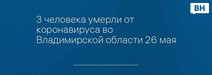По информации федерального оперштаба, по состоянию на 26 мая коронавирус забрал ещё 3 жизни во Владимирской области. Днем ранее было зарегистрировано 8 смертей. Общее число летальных случаев с начала пандемии составило 1 180.
